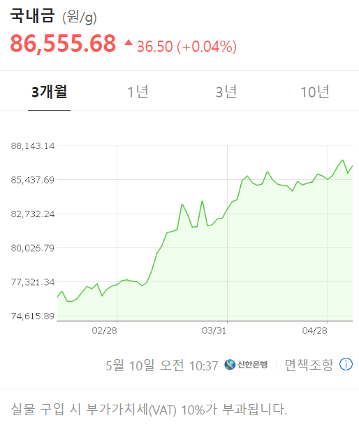 이와 함께 국내 금 가격도 상승하고 있으며, 현재 국내 금 가격은 86,555.68원 per gram으로, 최근 3개월 동안 약간의 변동을 보였습니다.